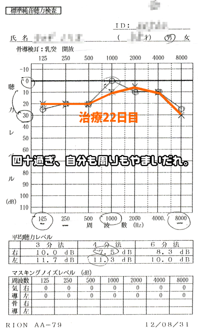 六日間、特に変化はありませんでした。妙に左耳の聞こえが良い日もあったり、なぜか両耳の閉塞感があったりと。しかし、相対的には聴こえ方そのものは良くなっていますが、左耳の閉塞感や違和感は取れていない、そんな感じでした。