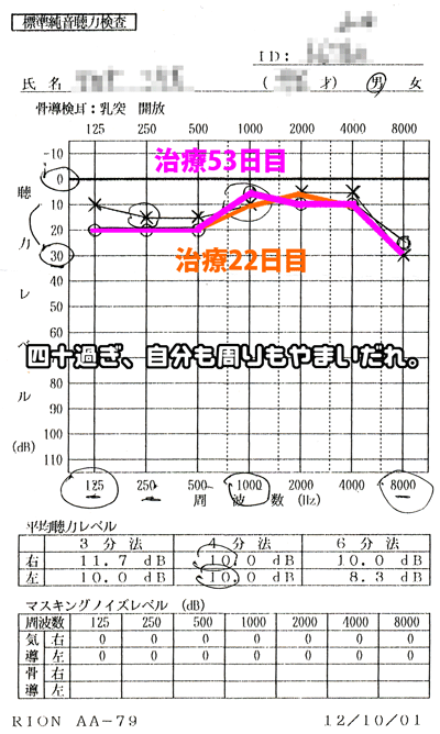 診察(5回目)…今回も聴力検査は左右の耳でやってもらいました。朝から両耳とも低音と高音域が聴こえないと言うより感じにくい印象でした。結果は写真の通り、「この3週間で良くなっているから、このままの治療を継続しましょう」と言うドクターの判断でした。